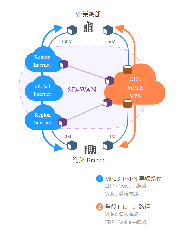 - The customer's headquarters is in Taiwan. There are 2 bases overseas, each having Internet and MPLS IPVPN services, with a large gap in the bandwidth between MPLS IPVPN and Internet