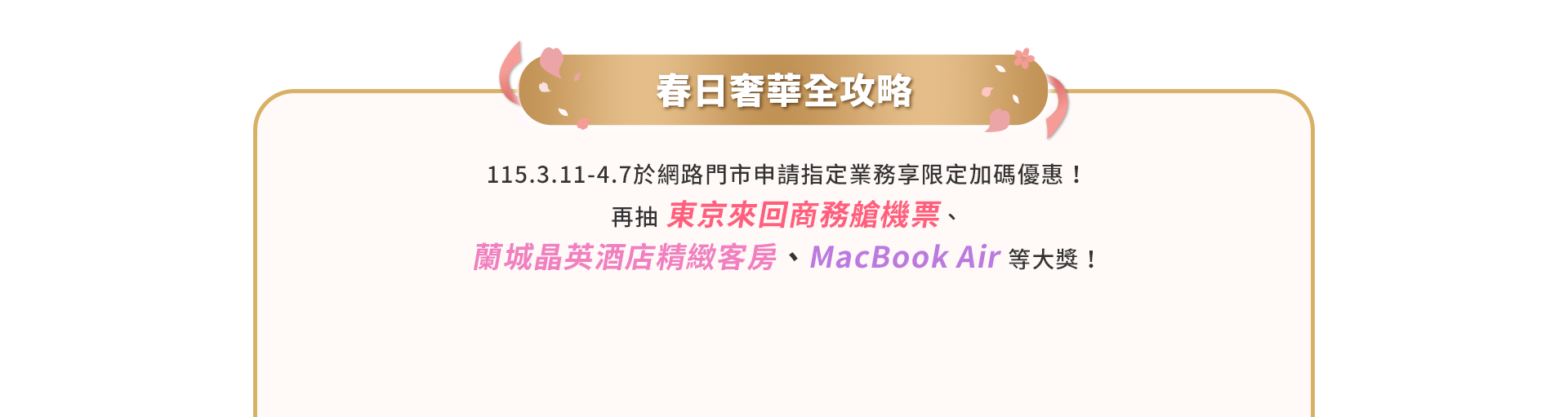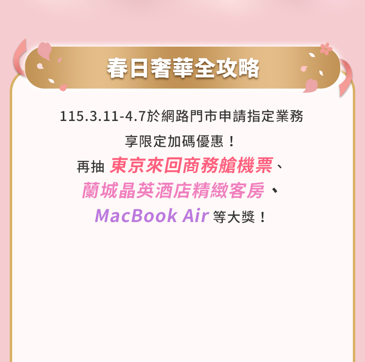 - 抽獎說明:主辦單位將以電腦系統亂數隨機抽出得獎者,UBA大專籃球聯賽門票須於115年4月7日(含)前竣工,MacBook Air須於4月10日(含)前竣工,其餘獎項申請單須於115年4月21日(含)前竣工,申請業務越多,中獎機會越大,惟活動期間每筆申請單限中獎乙次,不得重複中獎。