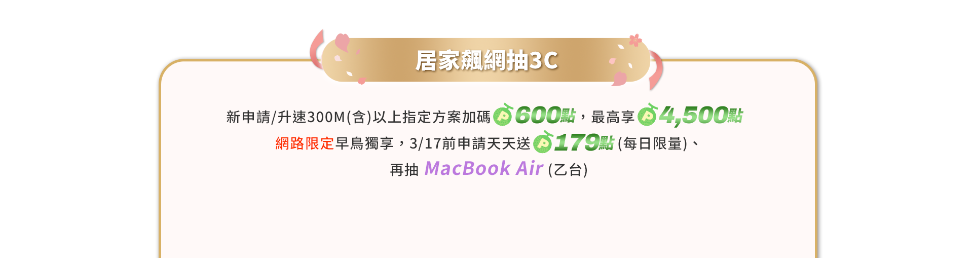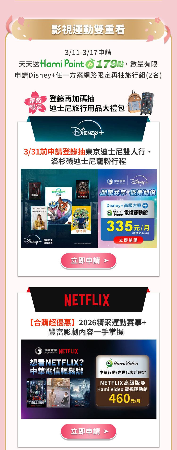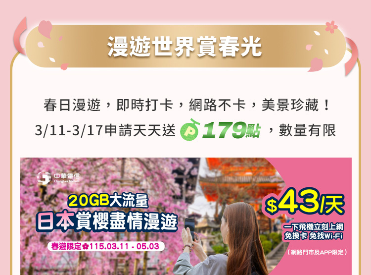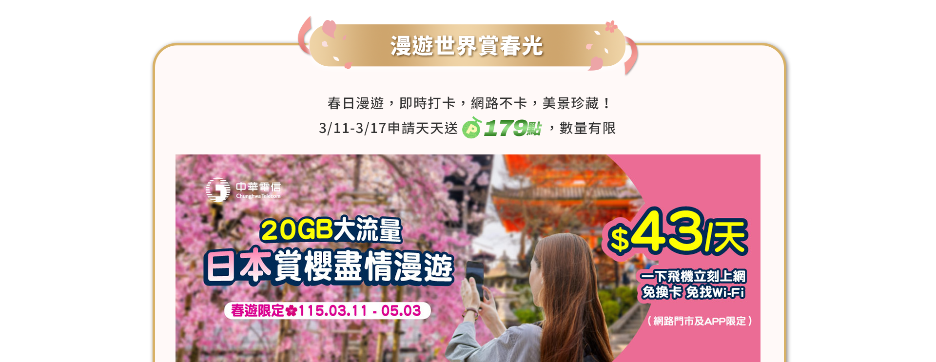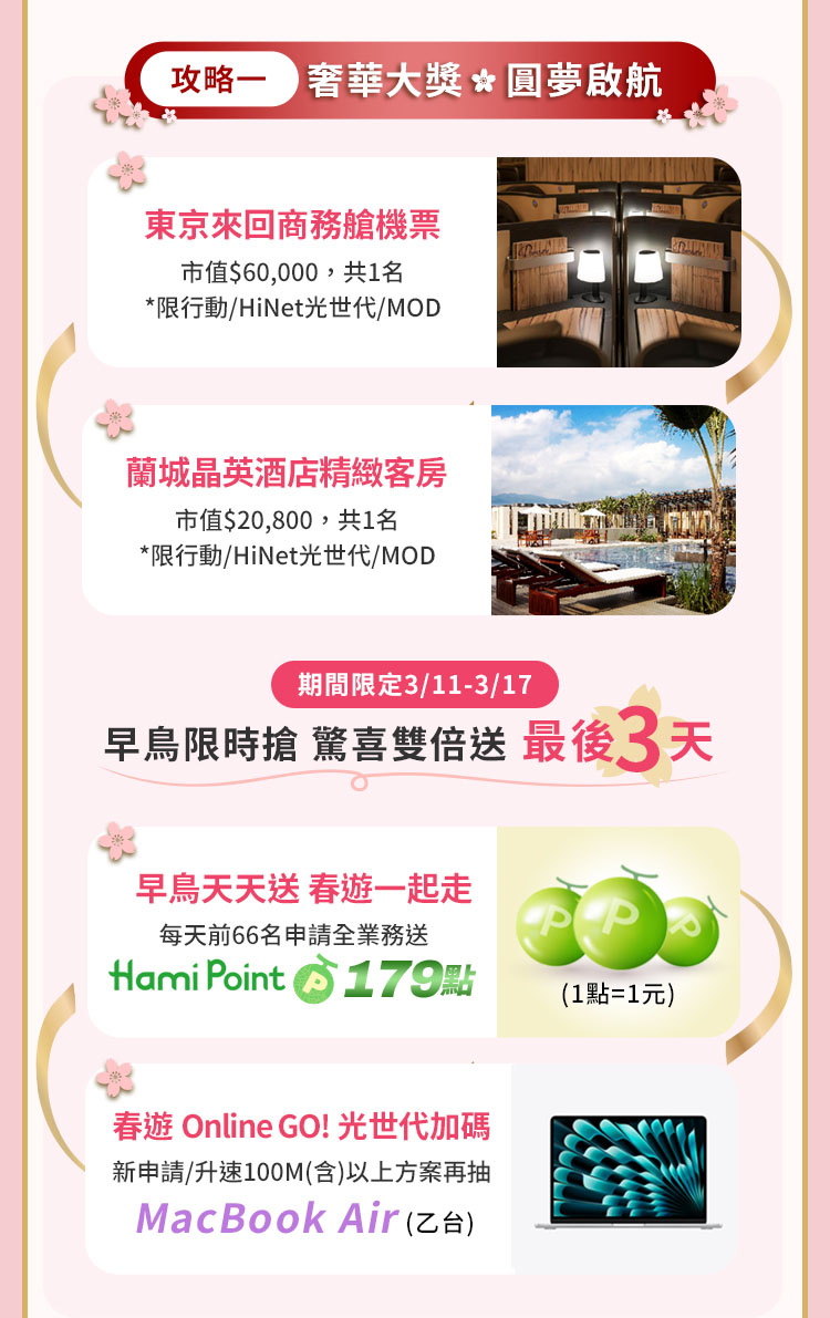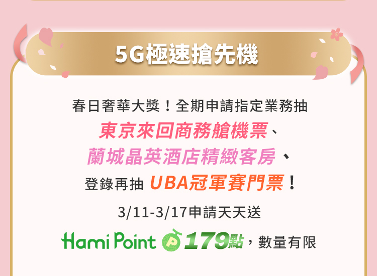 【獎項4】早鳥送Hami Point 179點:115年3月11日至3月17日連續7日 0點起計算,每日前66名申請且須於115年4月21日前(含)竣工;國際漫遊申請單需於活動期間內申請,並於4月21日23:59前生效才符合資格。申請額滿不另行於網頁公告。本活動獎項Hami Point需先加入中華電信會員,方可領取並使用Hami Point,點數使用、設定、查詢及網站會員等相關問題,請上Hami Point官網查詢或洽 0800-080-123 (中華市話、行動直撥123)客服專線。