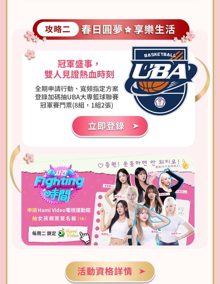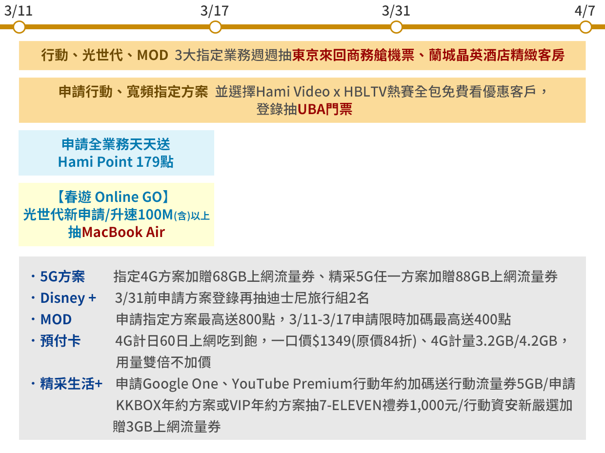 115/1/21-2/20期間於網路門市新申請/攜碼/續約行動精采5G購機/贈點、青春無敵方案;寬頻新申請/升速/續約速率300M(含)以上(不限方案),並選擇Hami Video x HBLTV熱賽全包免費看優惠,並完成登錄之客戶,即可參加抽獎。