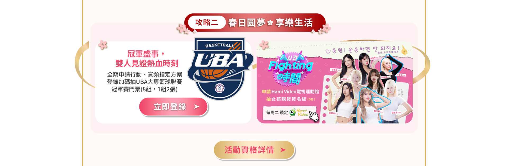 ※3/11-4/7申請,需登錄UBA大專籃球聯賽冠軍賽/季軍賽/四強賽門票(1名2張,隨機贈送,恕不挑場次) 8名 資格二註2 ★全期抽好禮