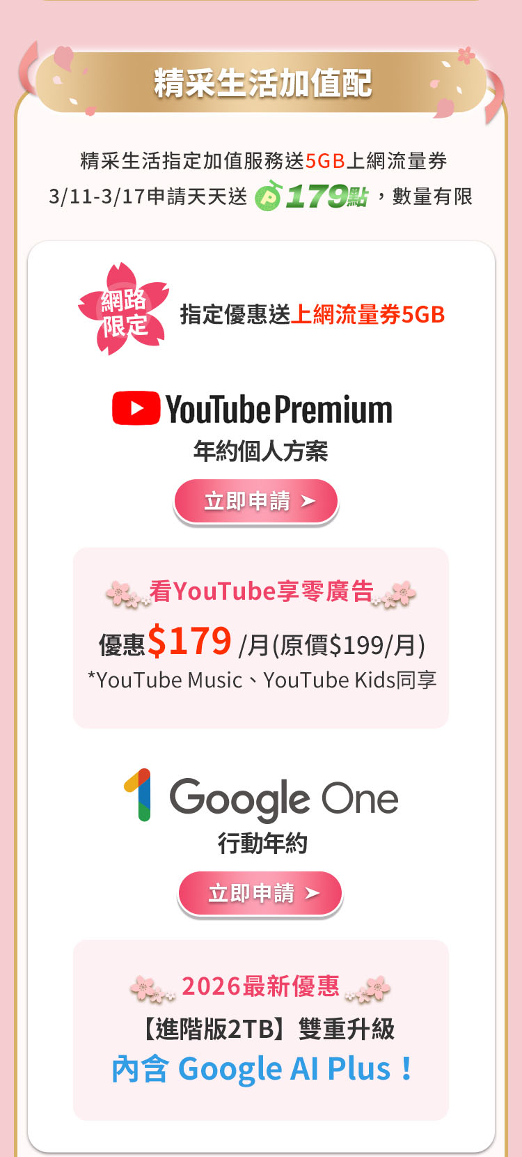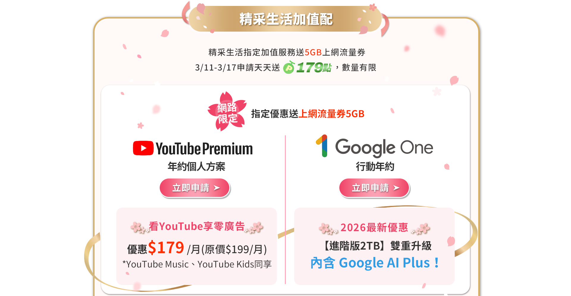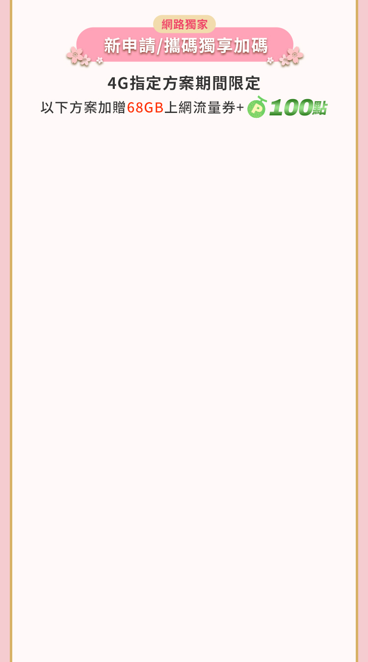 - 本活動指定方案之詳細內容及資訊,以中華電信網路門市及門市公告為準。參加者申請本活動指定方案,其相關權利義務悉依中華電信各該業務之營業規章與服務契約辦理。