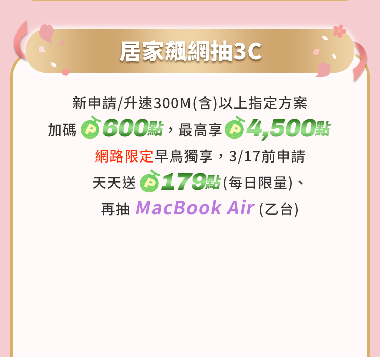 - 活動說明:活動期間於網路門市申請指定方案(申請單須於指定期間內竣工,若遇該申請單狀態為退貨中、待到店、已取消、鑑賞中、未生效、實體門市代為申請、客服代客下單等等皆不符合資格),即可參加抽獎。