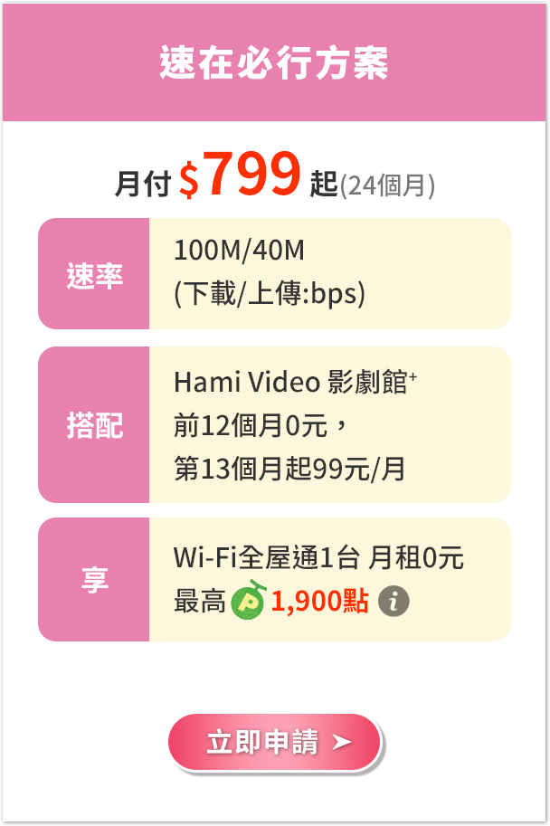 適用業務 新申請/升速HiNet光世代100M(含)以上速在必行/MOD家速/速在有禮/短期租用/Hami Cam整合方案(不含透過專人聯絡方式申請) *註1:續約申請精采5G月繳599(含)24個月以上方案(含購機/贈點/單門號),須為平續(含)以上資費方案(不低於原資費) 。