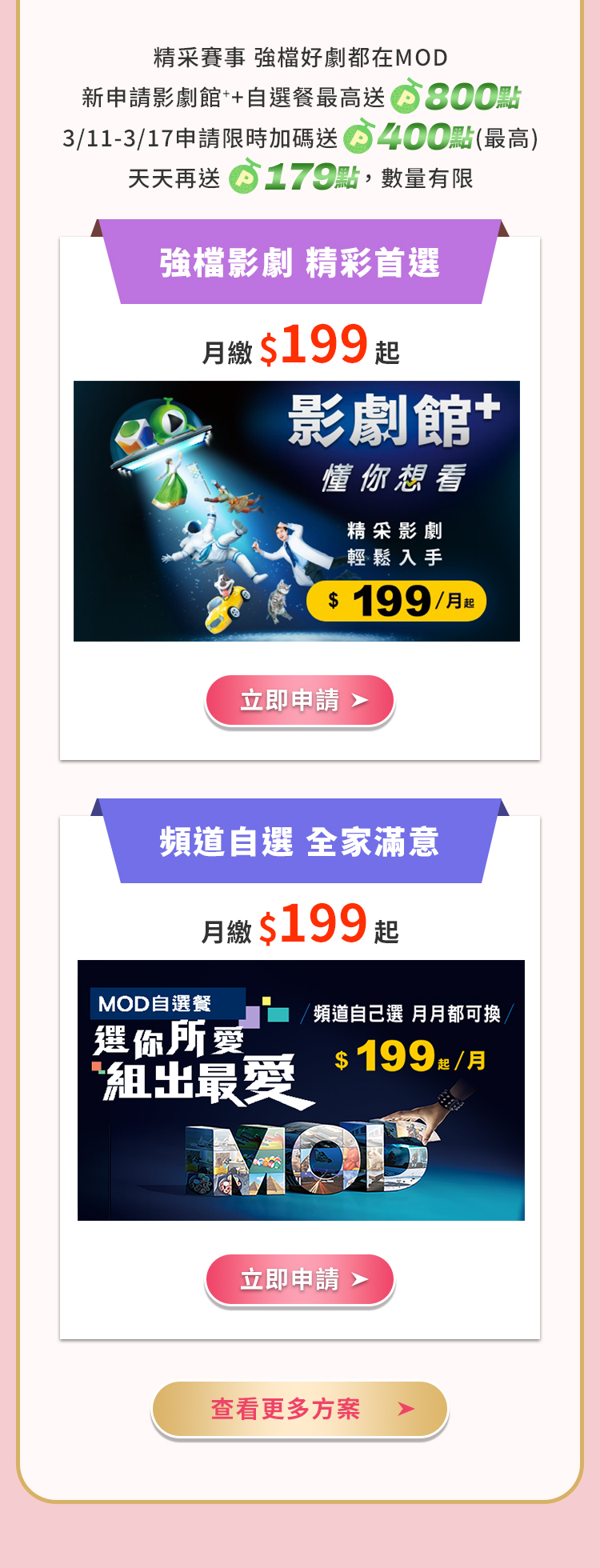 (以上皆不包含異動)光世代 ★新申請、升速、續約光世代100M/300M/500M/1G全方案(不含透過專人聯絡方式申請) MOD ★新申請MOD同時申請自選餐(全選/自選50/自選20)、新申請MOD同時申請「影劇館⁺」(不含透過專人聯絡方式申請) -
