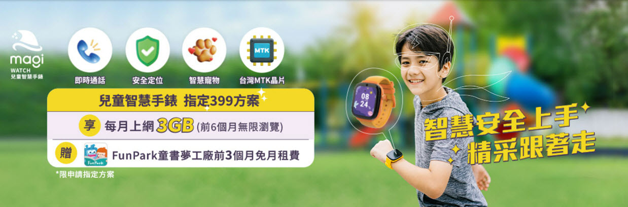 照顧孩童生活中的智慧安全,中華電信於全台服務據點及網路門市開賣MagiWatch兒童智慧手錶。MagiWatch 採用台灣聯發科晶片,整合 Google 地圖系統,及結合中華電信優質行動網路,滿足家長對聯繫與守護的雙重需求。申請大 4G 月繳 399 元(36 期),專案價 990 元,享前六個月上網無限瀏覽;期滿後,每月提供 3GB 上網量,網內通話前 3 分鐘免費!