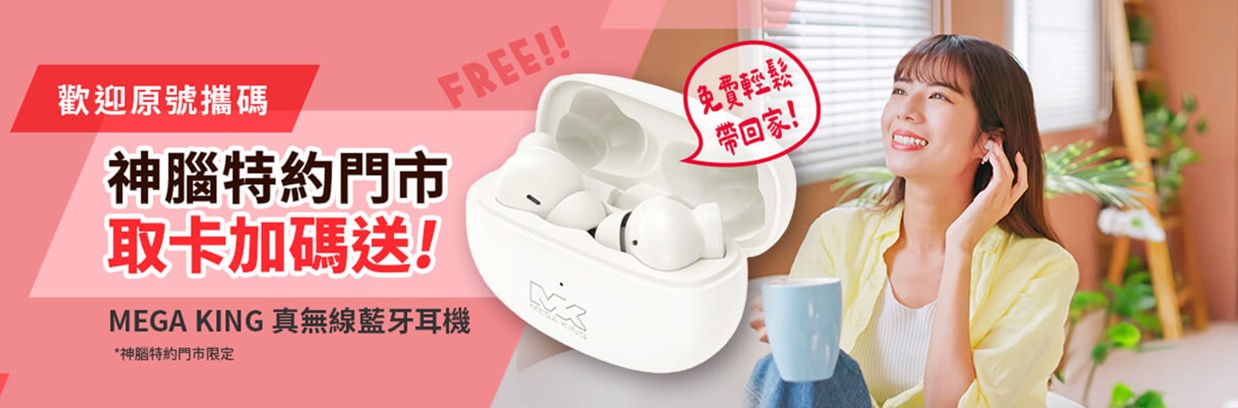 即日起~114/12/31,網路線上申請精采 5G 購機、贈點、單門號之新申請、攜碼客戶,於流程選「特約門市」取 SIM 卡,攜碼 5G 送「MEGA KING 真無線藍牙耳機」或新門號送「神腦購物金」500元!了解更多