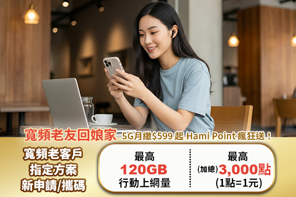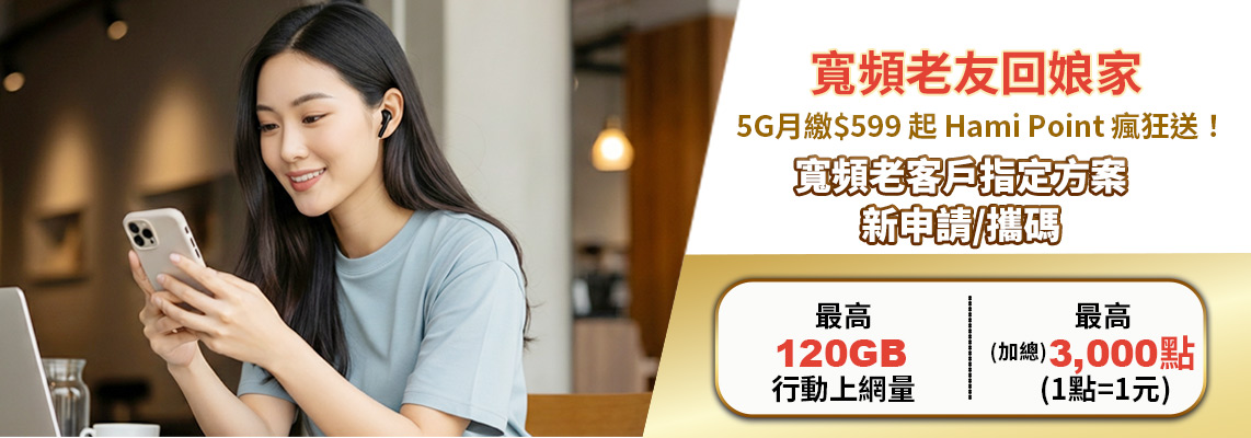 老客戶第2門專屬優惠 「新申請/攜碼」第2門(含以上)精采5G指定優惠, 享Hami Point 點數購物金最高$1,000或通信費$100 |