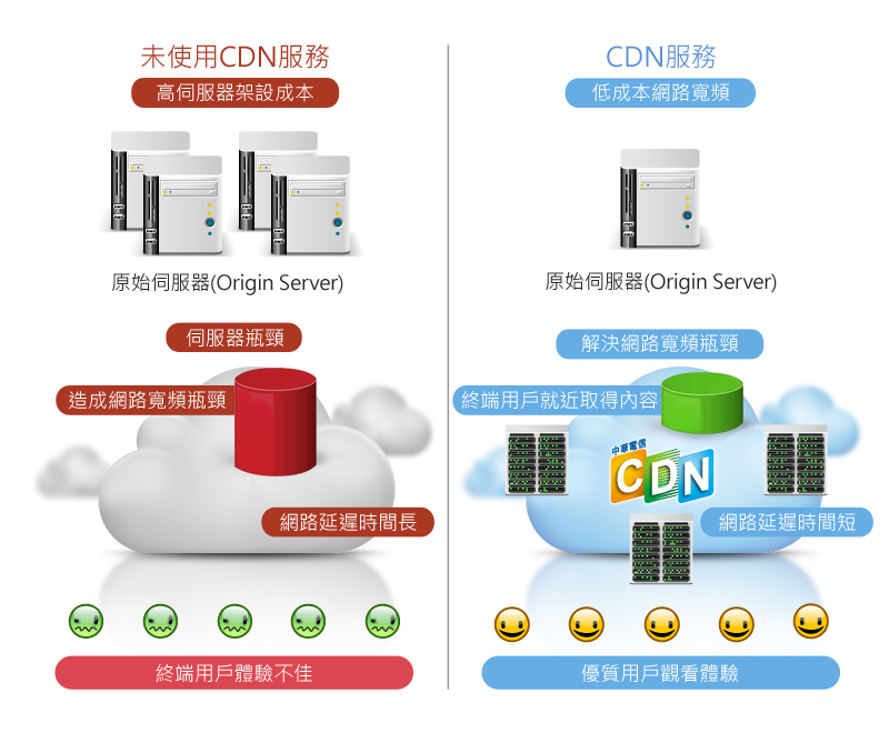 中華電信 CDN(Content Delivery Network,網路內容遞送服務)透過伺服器分身的概念,將原網站內容由近端CDN節點就近提供用戶服務,結合高速骨幹頻寬與綿密機房節點,導入最先進的內容遞送技術,為企業全面提升網站速度、性能與瀏覽體驗的最佳解決方案。