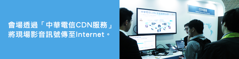 在會場上,中華電信數據分公司展出透過CDN技術將高品質即時影像資訊經由中華CDN影音平台傳送至全球Internet,此服務亦所稱「中華電信CDN影音一條龍服務」。以往,即時影音訊號派送至Internet需要付出高昂成本;如電子媒體透過SNG衛星新聞轉播(Satellite News Gathering)將現場訊號傳送出去,此技術除了需要自建高昂衛星傳輸設備外,亦容易受到天候等因素感擾。而中華電信此次展出中,直接透過DV及現場網路,搭配中華電信骨幹網路與CDN技術,將現場訊號傳送至Internet,現場參觀民眾可以透過手機與平板裝置,直接接收高品質影音內容。
