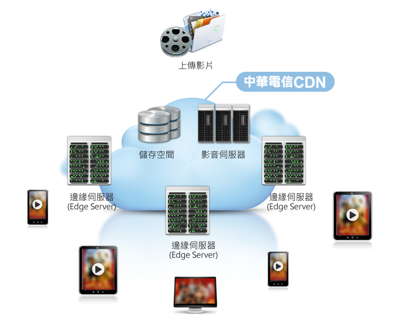 您可以將影片上傳至中華電信CDN平台,透過多螢VOD服務,可以將影片轉檔成支援多終端播放格式影片,並同時以高速度派送至客戶端。