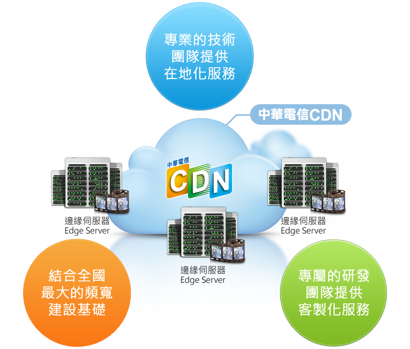 中華電信 CDN(Content Delivery Network,網路內容遞送服務)透過伺服器分身的概念,將原網站內容由近端CDN節點就近提供用戶服務,結合高速骨幹頻寬與綿密機房節點,導入最先進的內容遞送技術,為企業全面提升網站速度、性能與瀏覽體驗的最佳解決方案。