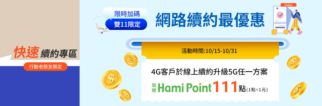 活動辦法:活動期間中華電信行動門號 4G 客戶限定,於網路門市續約 5G 任一方案(不包含客服代客受理下單,限平續或升級資費方案),加贈 111點 Hami Point!加贈 Hami Point 統一於 114/12/31 前完成贈點。