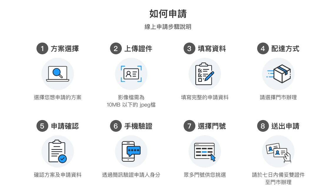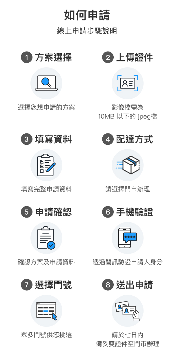 當您申請預付卡後,可獲得一張含上網量或通信費(視申請的方案而異)的SIM卡,根據需求隨時調整儲值方案,完成申請即可使用。