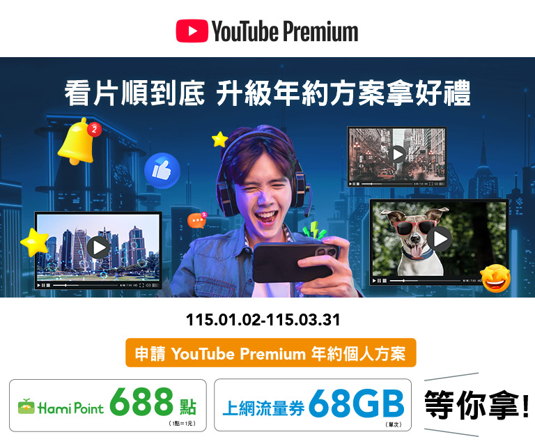限本公司月租型用戶,並申請指定方案,可享前4個月$0月租優惠。