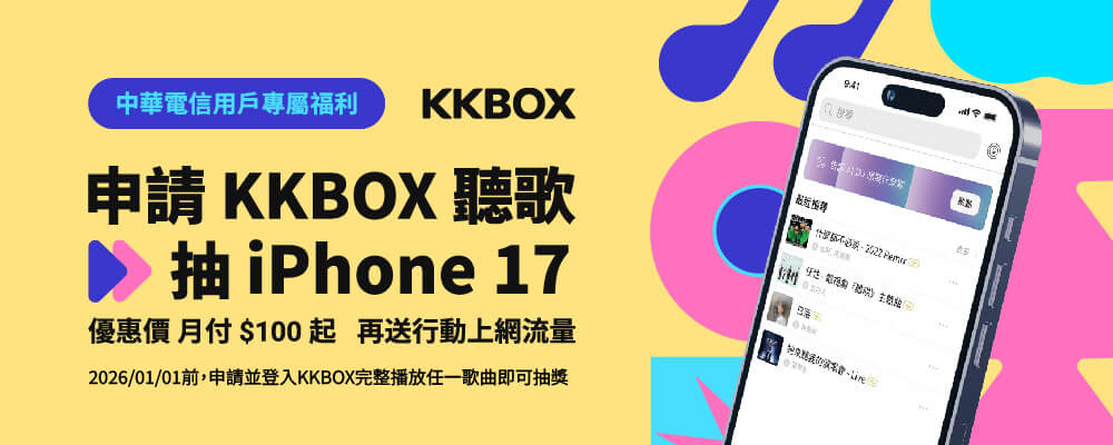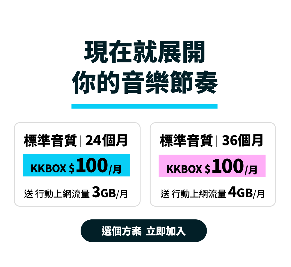 **流量大放送!! ** 申請KKBOX任一方案並完成開通啟用服務,就送3GB行動上網流量券(價值$450)>> 立即登錄拿好禮