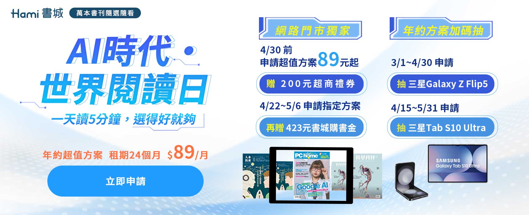 - 全通路抽三星 Tab S10 Ultra活動:115/04/15起至115/05/31,申請Hami書城月讀包任一付費年約方案,即享有抽三星平板Tab S10 Ultra(1名),Hami書城將於115/6/20(六)前Hami書城官網公布得獎名單並以簡訊通知得獎者。