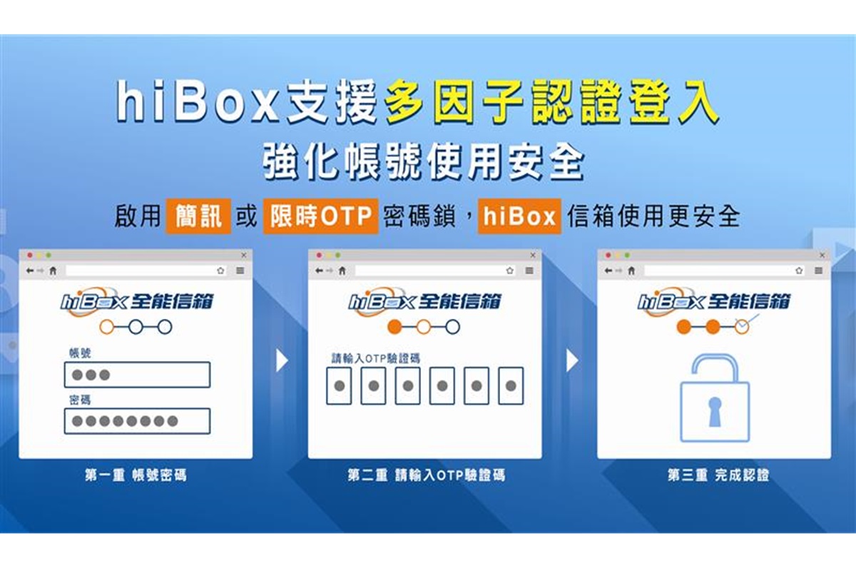 ▲中華電信hiBox全能信箱可支援「多因子認證服務」等加值服務,提供二次身分認證確保合法用戶登入。