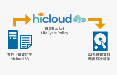 冷儲存為hicloud儲存類別中最低成本的儲存方案,提供數年或更久的資料保存,適合有大量資料需長期保存且不需頻繁存取,或原本使用磁帶系統備份的客戶。透過設定檔案生命週期LifeCycle自動轉存物件,操作簡單滿足客戶長期資料備份需求,更能降低企業儲存成本。