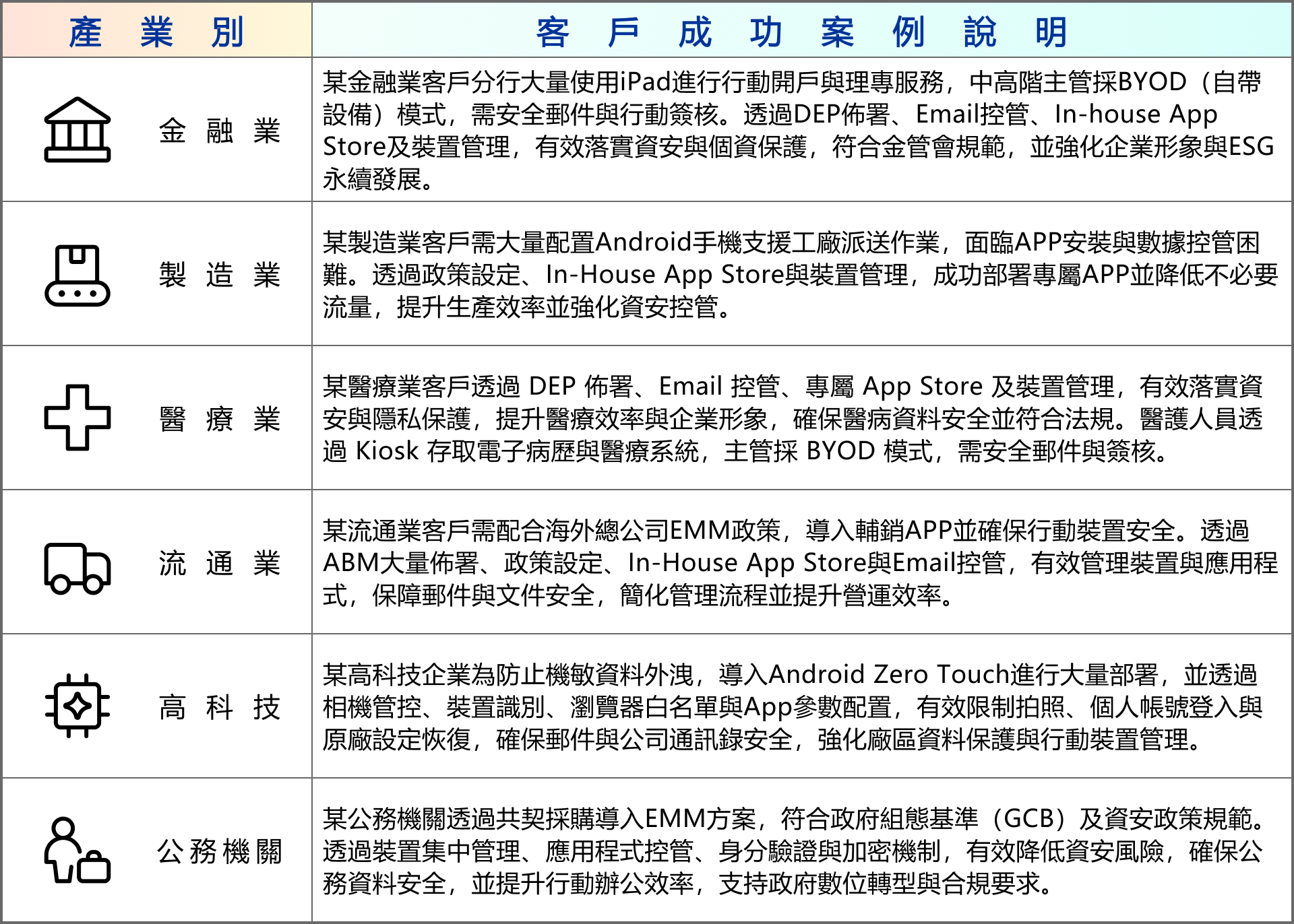 - 降低IT管理成本:快速大量部屬APP、設備合規檢查。