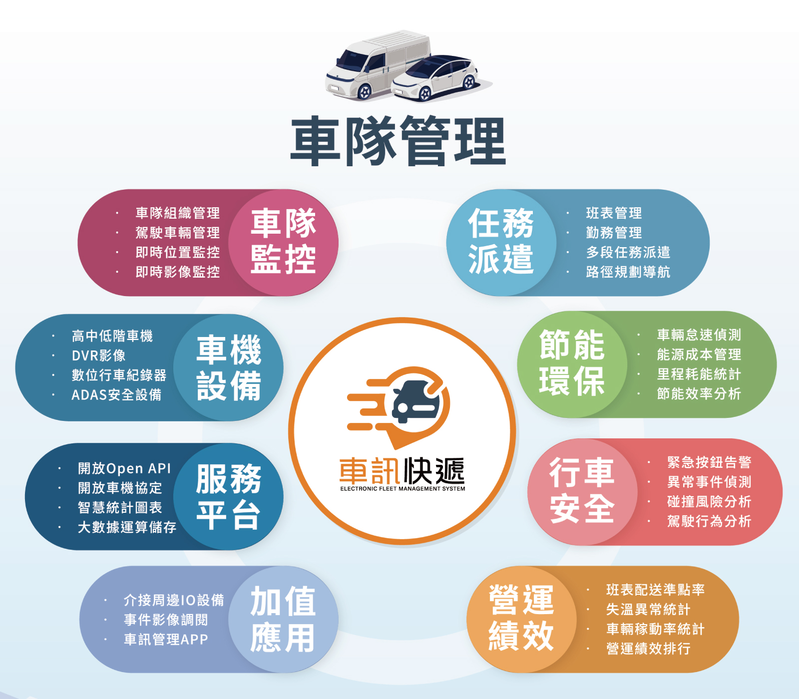 藉由電子化管理流程及報表製作,網站型服務提供Web網站與電子地圖,管理者可經由網頁瀏覽器視窗操作環境,執行車隊監控派遣作業;轉接型服務提供車機、e-化終端設備資料與客戶之e-化資訊系統間的轉遞服務;專案型服務則提供整合資訊應用系統軟體服務。