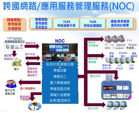 Chunghwa Telecom's NOC service platform incorporates the EyeSee (globally integrated monitoring system) and cross-border customer service application systems. EyeSee can manage both foreign and domestic LAN and WAN resources and ICT equipment efficiency information. Customer service application systems provide customers with functions tailored to customer needs. And paired with Chunghwa Telecom's professional technical/service personnel, we can provide customers with all-day, all-year customer services and a project management service platform.