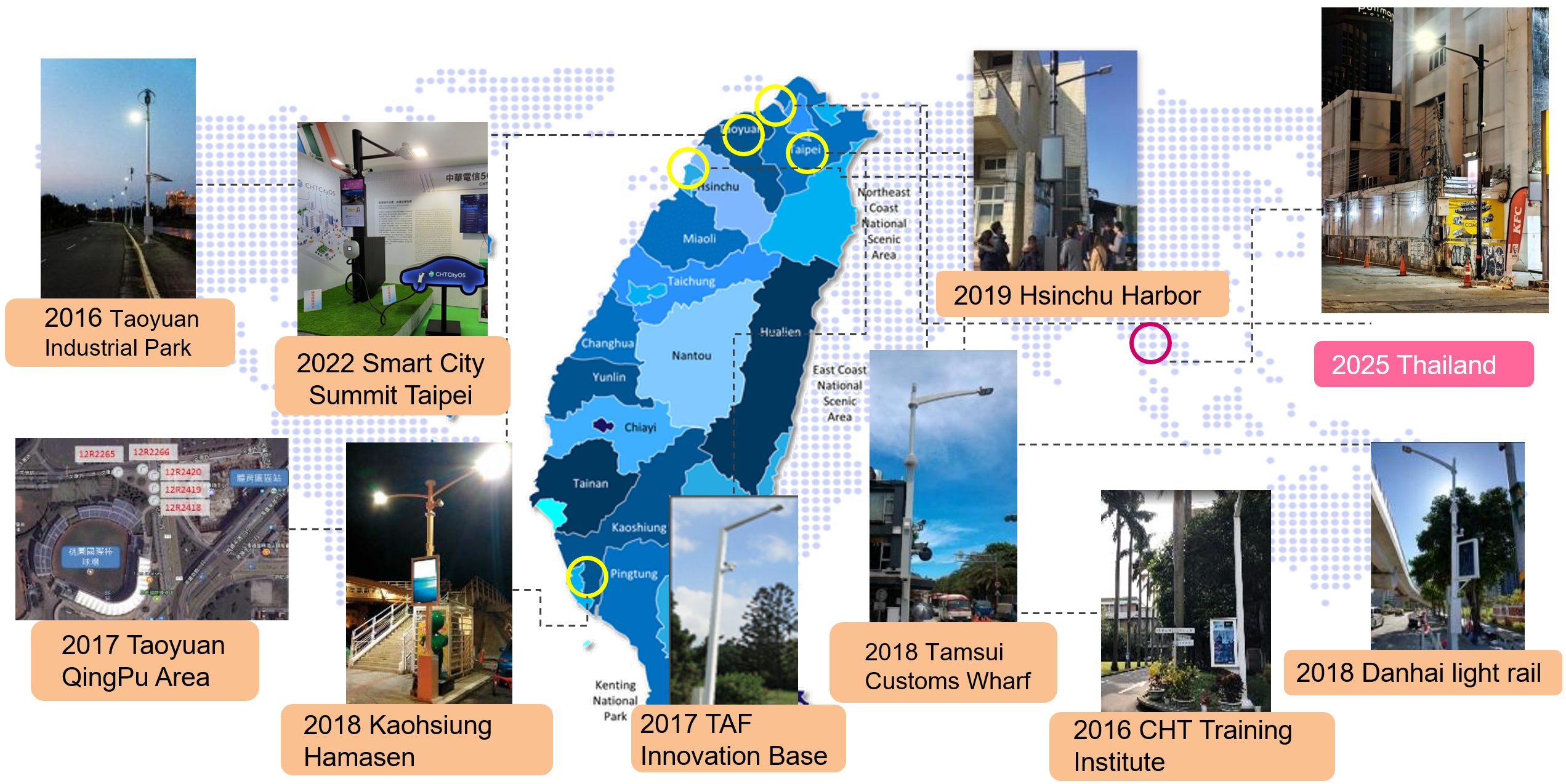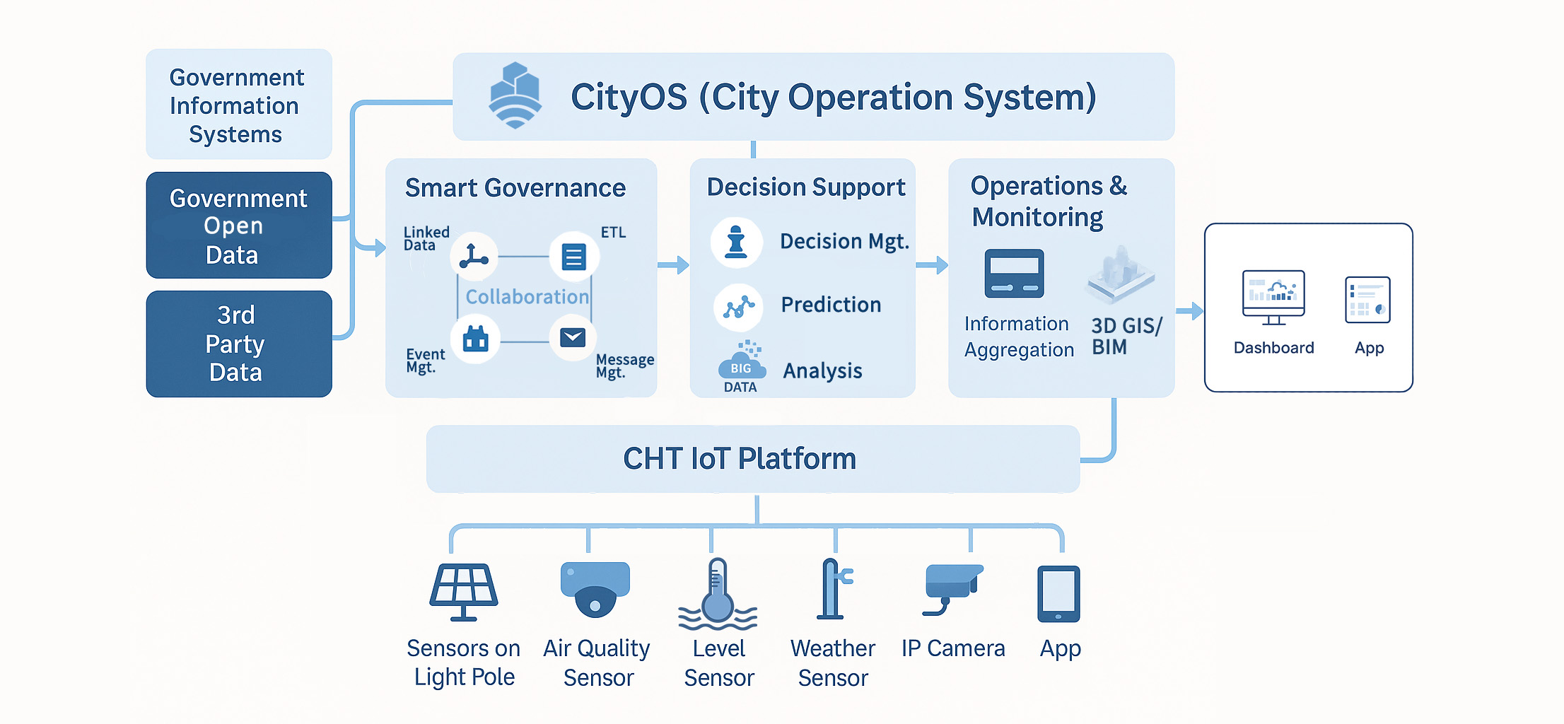 Our Smart City solution is built around CityOS, a City-Governance 360 platform developed in-house by Chunghwa Telecom with real-time dashboard, smart event trigger, and full support of IoT connections to enable a smarter and safer city.