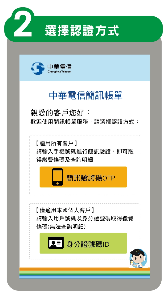 簡訊帳單客戶可利用本公司發送簡訊之繳費連結,輕鬆e點完成線上繳費;亦可登入認證取得個人專屬繳費條碼,至中華電信服務據點、神腦、統一(或ibon補單)、全家(或FamiPort補單)、萊爾富(或Life-ET補單)、OK(或OK‧go補單)超商繳費。此外,點選繳費條碼頁面上的「費用明細」即可查詢相關費用/通話明細資料,帳單資訊隨時e指掌握!
