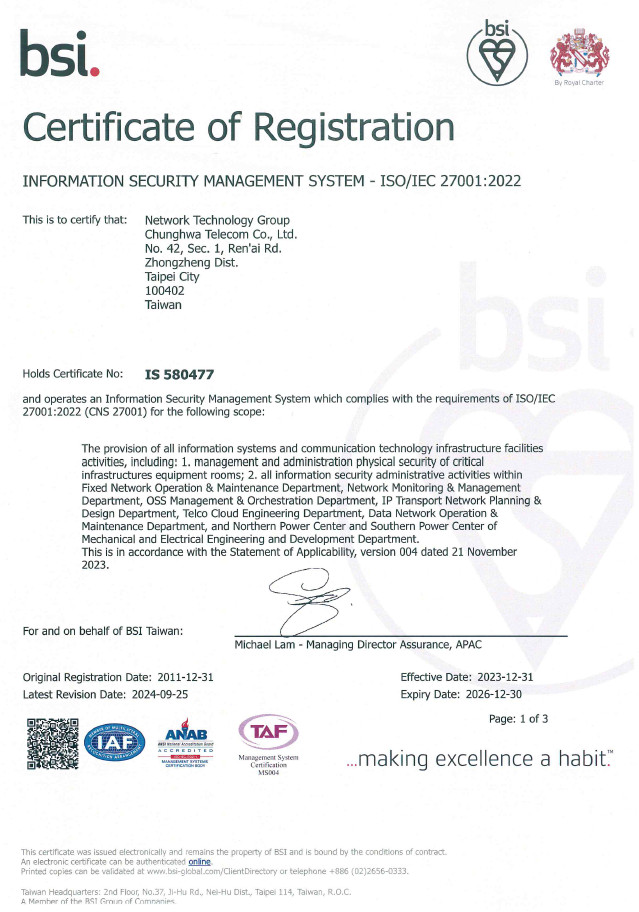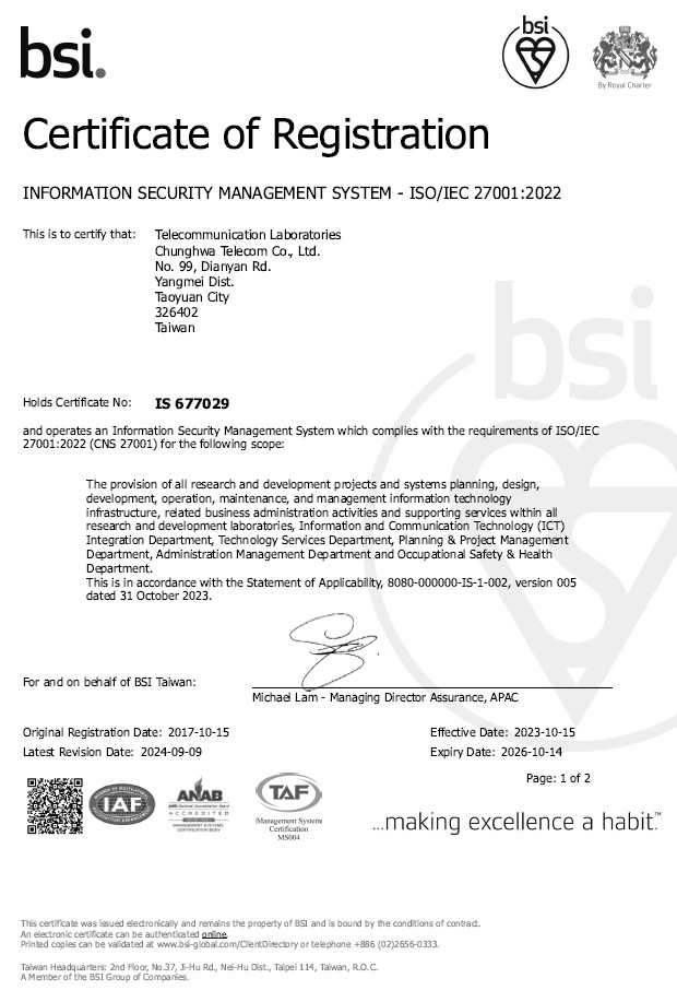 - 中華電信建置符合國際標準的資訊安全管理系統,並以風險管理為導向,每年根據外部環境及內部風險評估結果,修訂《資通安全政策》與相關規範。