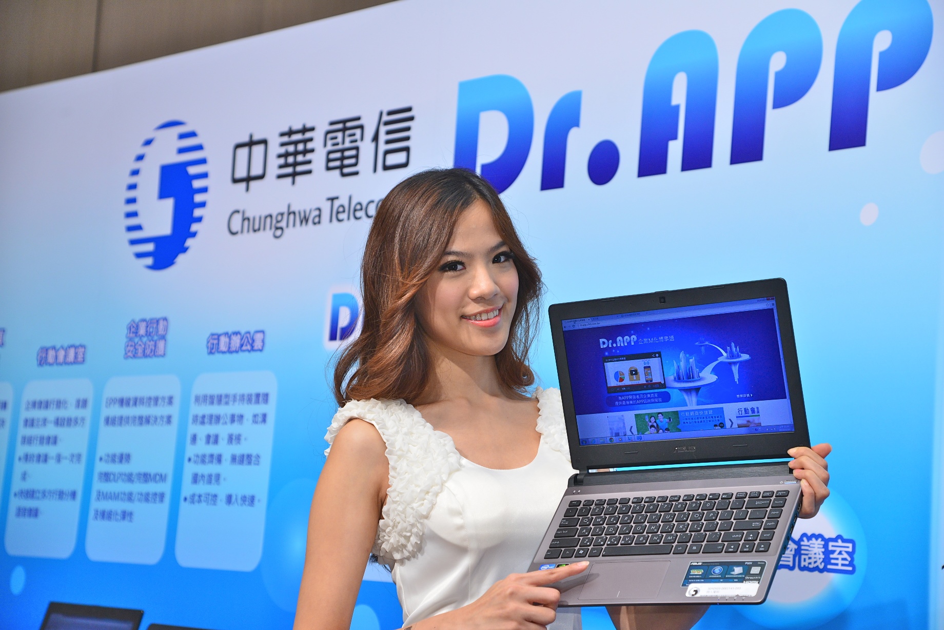 中華電信《Dr.APP企業M化博事通》提供《行動辦公雲》、《企業行動安全防護(MDM)》、《行動會議室》、《行動推播》及《行動網頁快速建》五大行動商務服務,以及結合APP開發商共同針對觀光、校園、零售通路、維修巡檢等不同產業提供企業客製APP解決方案,並提供企業客戶一個管理入口,協助企業客戶進行APP管理及佈署,以低門檻、高品質的APP方式快速導入企業,為企業客戶進行M化(Mobilize,意即「行動化」)體質調整,迎接4G時代的新商機,並於即日起宣布開放企業客戶體驗。